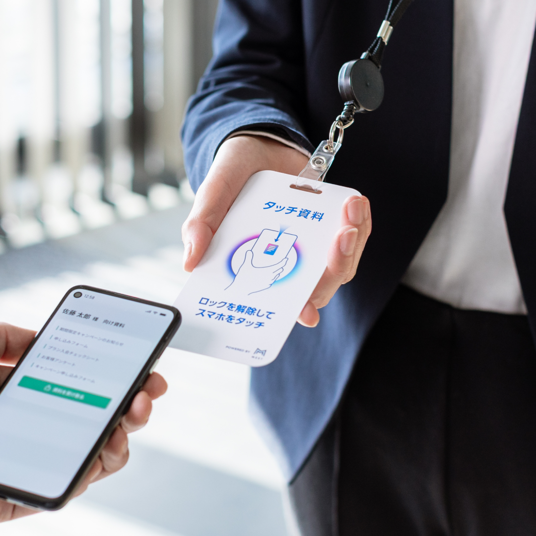 スタッフが首から下げられるようストラップ穴があいたMEET 30枚パックです。表面にはタッチ資料のオフィシャルデザイン入り。裏面はオリジナル印刷が可能で、ロゴやデザインを自由に入れてご活用いただけます。